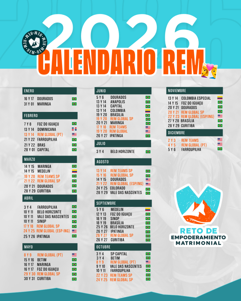 REM ha sido creado para todos aquellos que desean invertir en su matrimonio y llevar su matrimonio a otro nivel, ¡REM es una experiencia de shock, literal! ¡Son dos días intensos, apartados de todos y de todo para enfocarte en iniciar un nuevo capítulo para tu familia.!